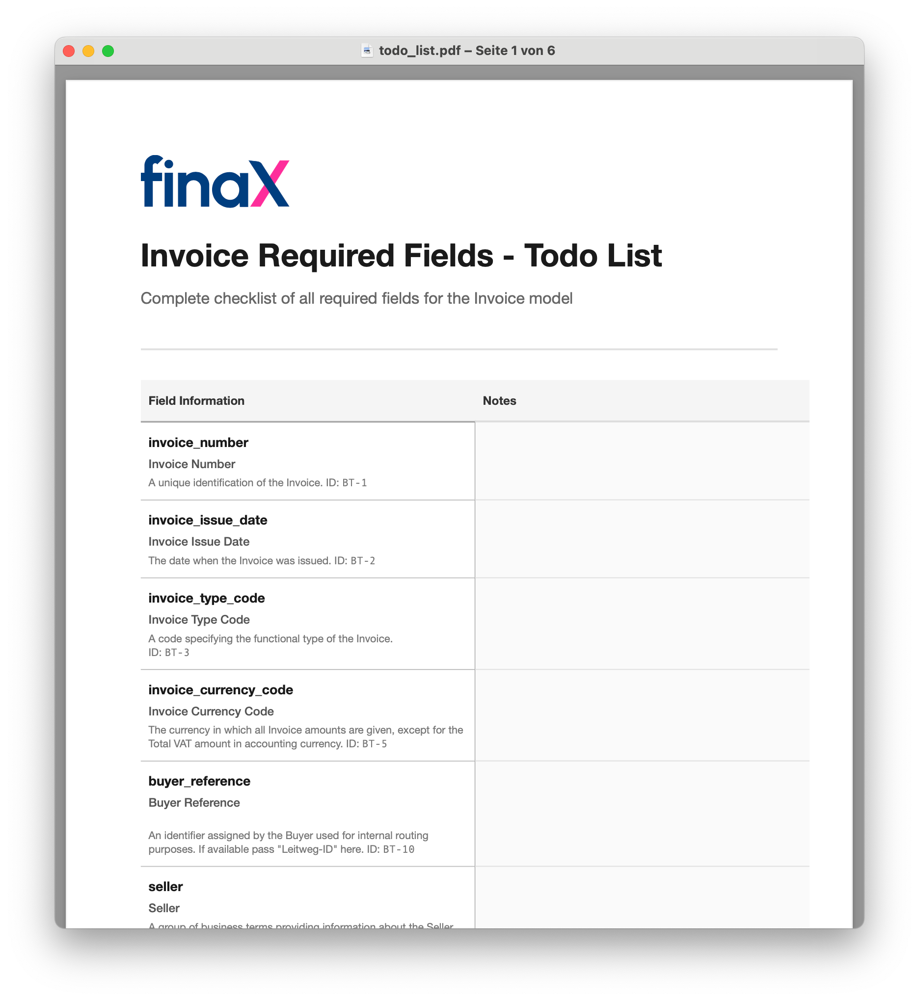 We created a todo list pdf that contains all mandatory fields for creating valid XRechnung (UBL/CII) and ZUGFeRD invoices using the finaX API. You can download it here.